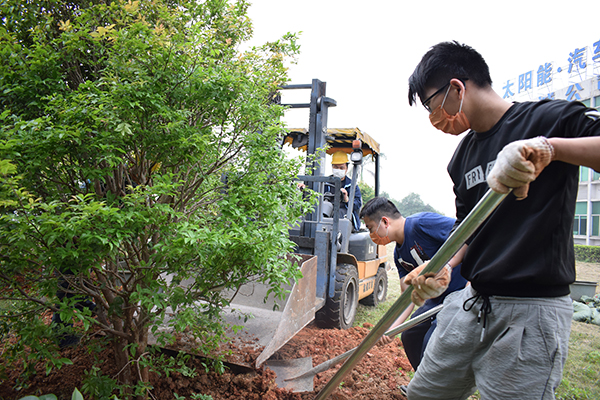 “樹坑要挖深一點,草屑要鋪均勻,袋裝的肥土均勻下在底部,填土?xí)r要把樹扶正,土一定要壓實……”在有經(jīng)驗的志愿者講解和指導(dǎo)下,平日里專注于產(chǎn)線的工人們,瞬間變成了一個個種樹能手。每個工序都一絲不茍,挖坑、施肥、填土、澆水,嚴(yán)謹(jǐn)?shù)轿?。雖然揮汗如雨,但卻干勁十足。志愿者們這次栽種的是嘉寶果樹,由于樹苗較大較重,平時工作中的老伙計——叉車也出動了。幾個小時后,仕誠公司的草坪上,又翻出了許多新土,也增添了一排整齊翠綠的果樹。迎著春日的暖陽,志愿者們在新種的果樹前留下了美麗瞬間。